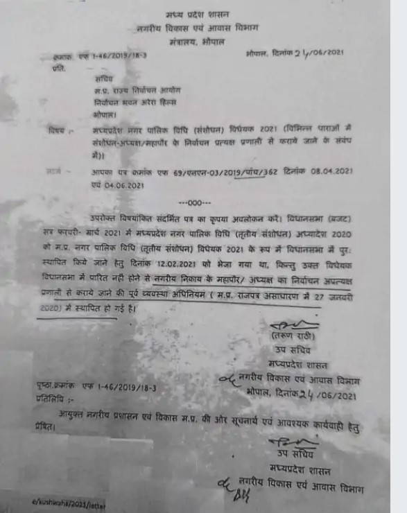 कमलनाथ सरकार के सत्ता से बाहर होने के बाद शिवराज सरकार ने दिसंबर 2020 में कमलनाथ सरकार के फैसले को पलट दिया था। यानी महापौर और अध्यक्ष का चुनाव प्रत्यक्ष प्रणाली से कराने का अध्यादेश जारी कर दिया था। अध्यादेश की अवधि समाप्त होने से पहले मध्य प्रदेश नगर पालिक विधि (संशोधन) विधेयक 2021 को शिवराज सरकार ने विधानसभा के बजट सत्र में पेश नहीं किया था। जबकि प्रस्तावित विधेयक को कैबिनेट से मंजूरी दे दी गई थी। आयोग को लिखे पत्र में सरकार ने इसका हवाला दिया है कि विधेयक को विधानसभा से मंजूरी नहीं मिलने के कारण अप्रत्यक्ष प्रणाली से चुनाव कराए जाएं।