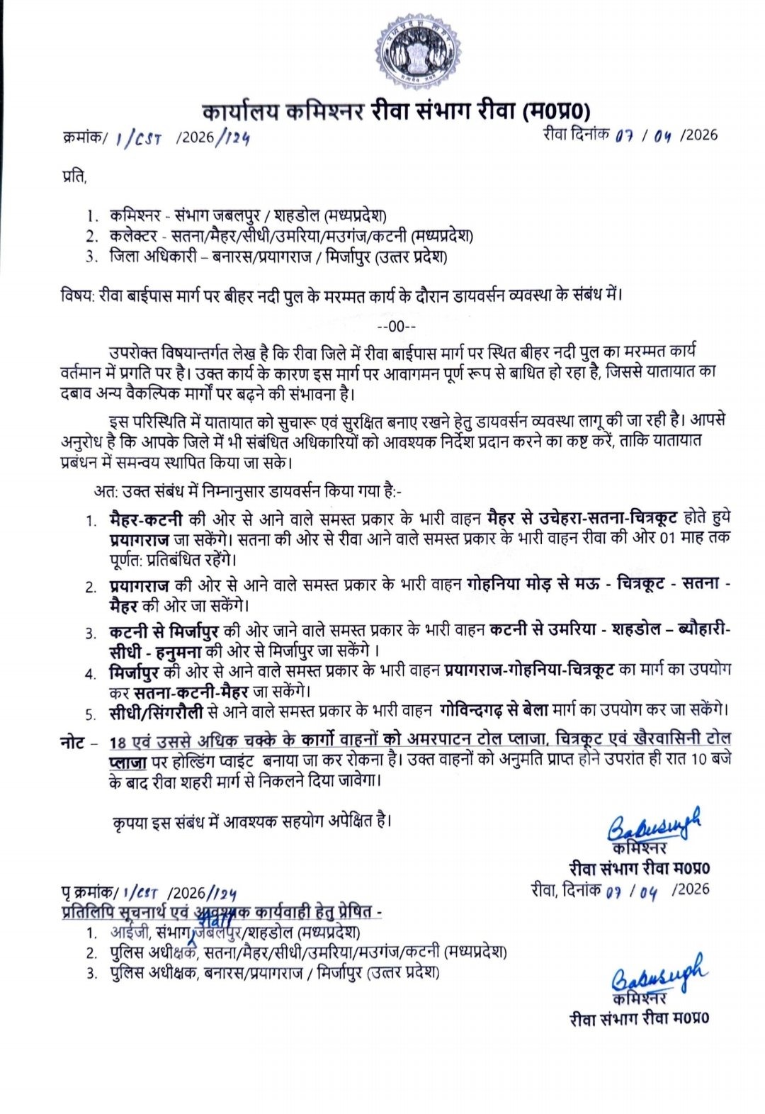 रीवा बायपास मार्ग पर स्थित बीहर नदी पुल के मरम्मत कार्य के कारण ट्रैफिक डायवर्जन किया गया है। सतना, मैहर, प्रयागराज और मिर्जापुर की ओर जाने वाले भारी वाहनों के लिए नए मार्ग निर्धारित किए गए हैं।